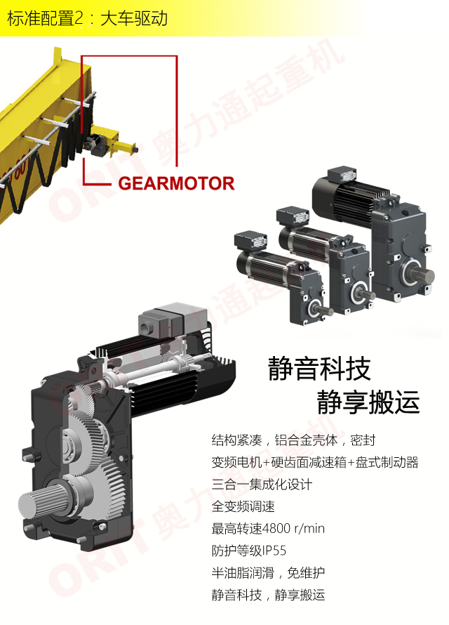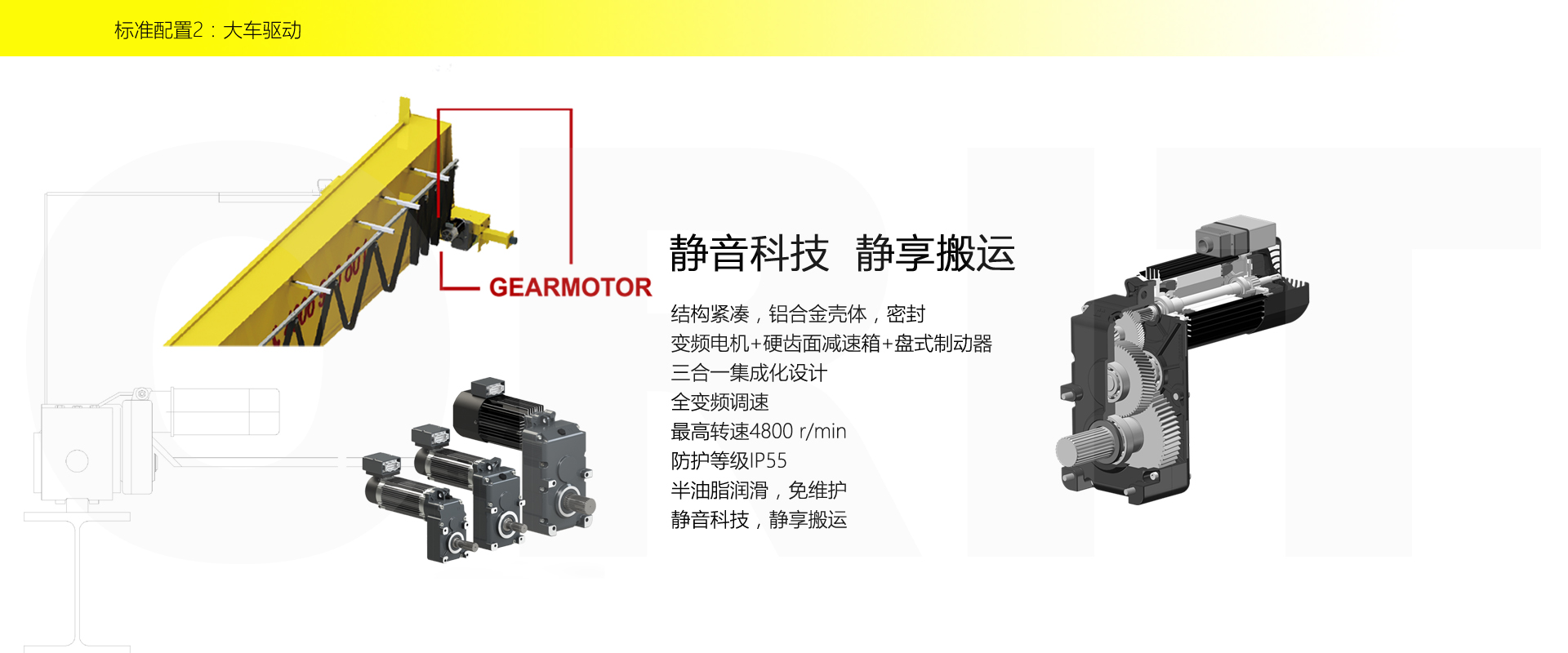 产品名称:双梁桥式起重机 小身材、大能力、高智慧 优化设计,自重轻,轮压小,高度矮 硬齿面柔性驱动,紧凑型结构 变频控制,运行平稳 实时安全监控,确保吊运安全 标准化配置,让性能无比稳定 适用于80t以下双梁起重机 标准配置1:起升机构 颠覆传统,自成一体 SWL(t) HOL(m) 0.8t-80t Max.90m 低净空设计 柔性驱动,内应力小,传动效率高 柔性铰接小车架 重级制电机,接电持续率60%ED 行走变频无极调速,运行平稳 自调试电磁盘式制动器,可靠,防尘 2160N/mm² 高强度镀锌钢丝绳,免维护 全周型导绳器,防松绳 全系标配安全监控系统 标准配置2:三合一驱动 静音科技,静享搬运 结构紧凑,铝合金壳体,密封 变频电机+硬齿面减速箱+盘式制动器 三合一集成化设计 全变频调速 最高转速4800 r/min 防护等级IP55 半油脂润滑,免维护 静音科技,静享搬运 标准配置3:电控系统 安全随心掌控 智能安全监控器 计算起升机构剩余安全工作时间 累计起升工作时间 累计超载次数 累计起升电机启动次数 起升电机过热保护及报警 刹车片厚度报警 ... ... 远程通讯 施耐德电气元件 航空插座接口 IP55防护等级 标准配置4:端梁 多变灵活,适应自如 模块化直驱设计 自重轻、体积小 多种连接方式,安装尺寸灵活 适用各种厂房,降低厂房高度 QT700车轮,自润滑,更静音 采用调心轴承,适应更自如 应用