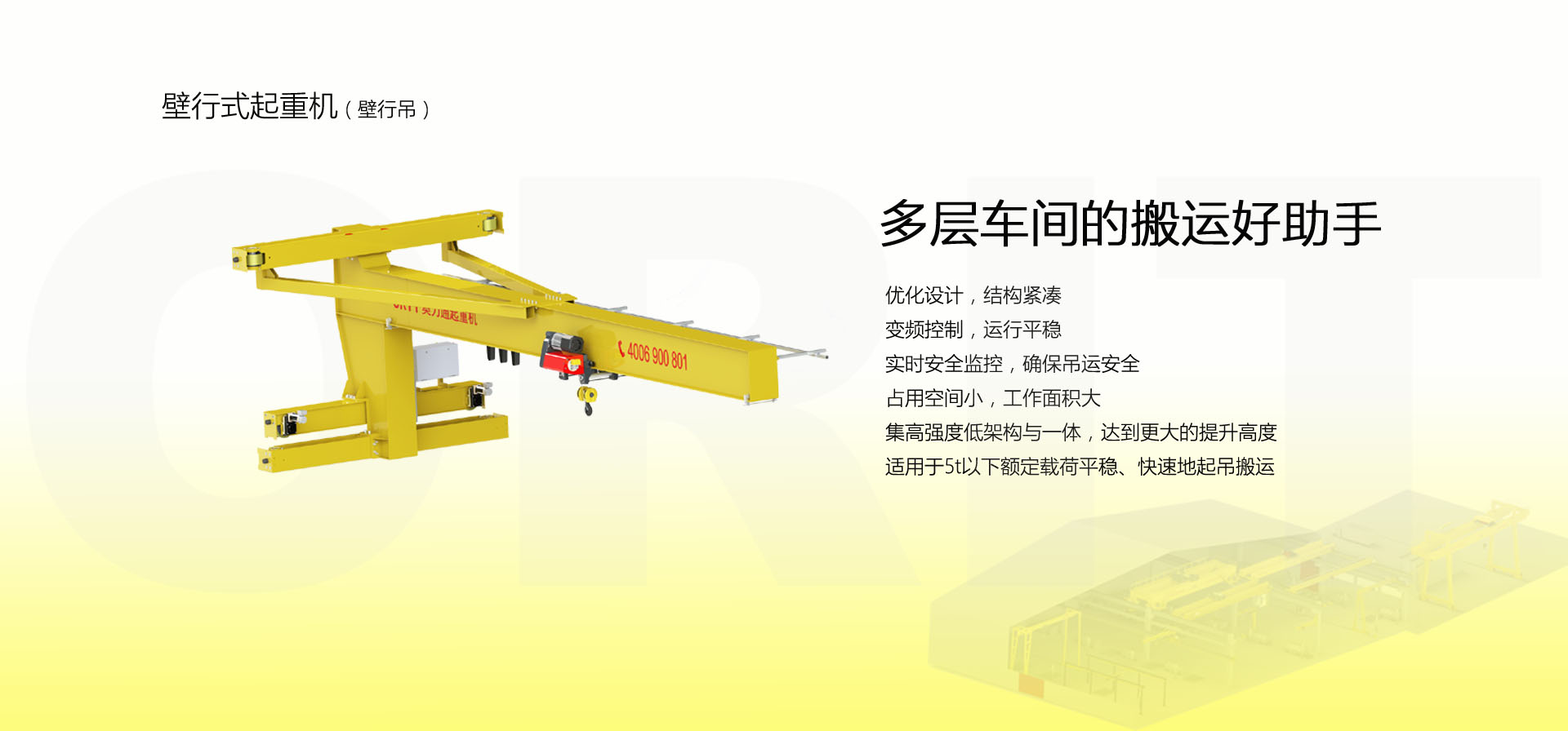 产品名称:壁行式起重机 多层车间的最佳选择 优化设计,结构紧凑 变频控制,运行平稳 实时安全监控,确保吊运安全 占用空间小,工作面积大 集高强度低架构与一体,达到最大的提升设计 适用于5t以下额定载荷平稳、快速地起吊搬运。 标准配置1:起升机构 颠覆传统,自成一体 低净空设计 柔性驱动,内应力小,传动效率高 重级制电机,接电持续率60%ED 行走变频无极调速,运行平稳 自调试电磁盘式制动器,可靠,防尘 2160N/mm² 高强度镀锌钢丝绳,免维护 全周型导绳器,防松绳 全系标配安全监控系统 标准配置2:三合一驱动 静音科技,静享搬运 结构紧凑,铝合金壳体,密封 变频电机+硬齿面减速箱+盘式制动器 龙门专用C型三合一集成化设计,节约空间 全变频调速 最高转速4800 r/min 防护等级IP55 半油脂润滑,免维护 静音科技,静享搬运 标准配置3:电控系统 安全随心掌控 智能安全监控器 计算起升机构剩余安全工作时间 累计起升工作时间 累计超载次数 累计起升电机启动次数 起升电机过热保护及报警 刹车片厚度报警 ... ... 远程通讯 施耐德电气元件 航空插座接口 IP55防护等级 标准配置4:端梁 多变灵活,适应自如 模块化直驱设计 自重轻、体积小 QT700车轮,自润滑,更静音 采用调心轴承,适应更自如 双轮缘端梁与平轮端梁完美结合, 既满足受力要求, 又彻底的解决了三条端梁(轨道)可能产生的啃轨问题。 应用